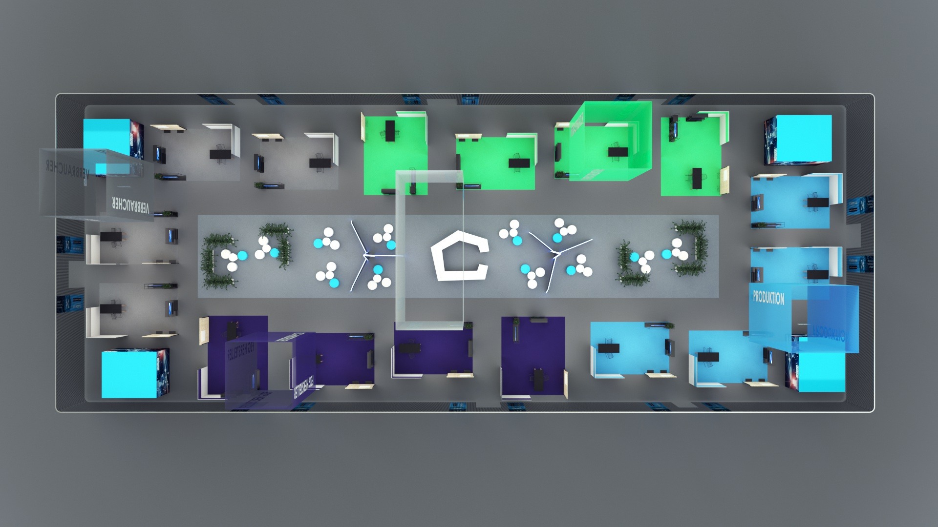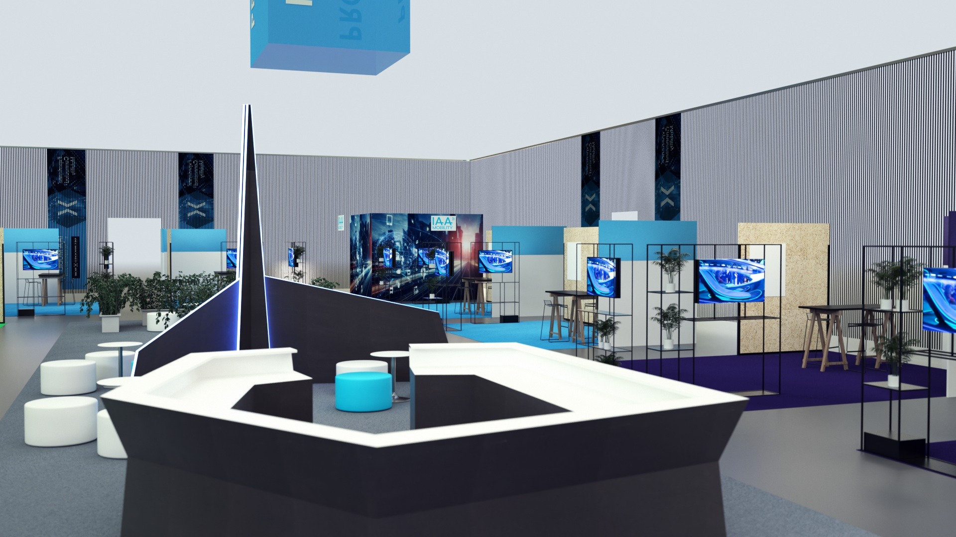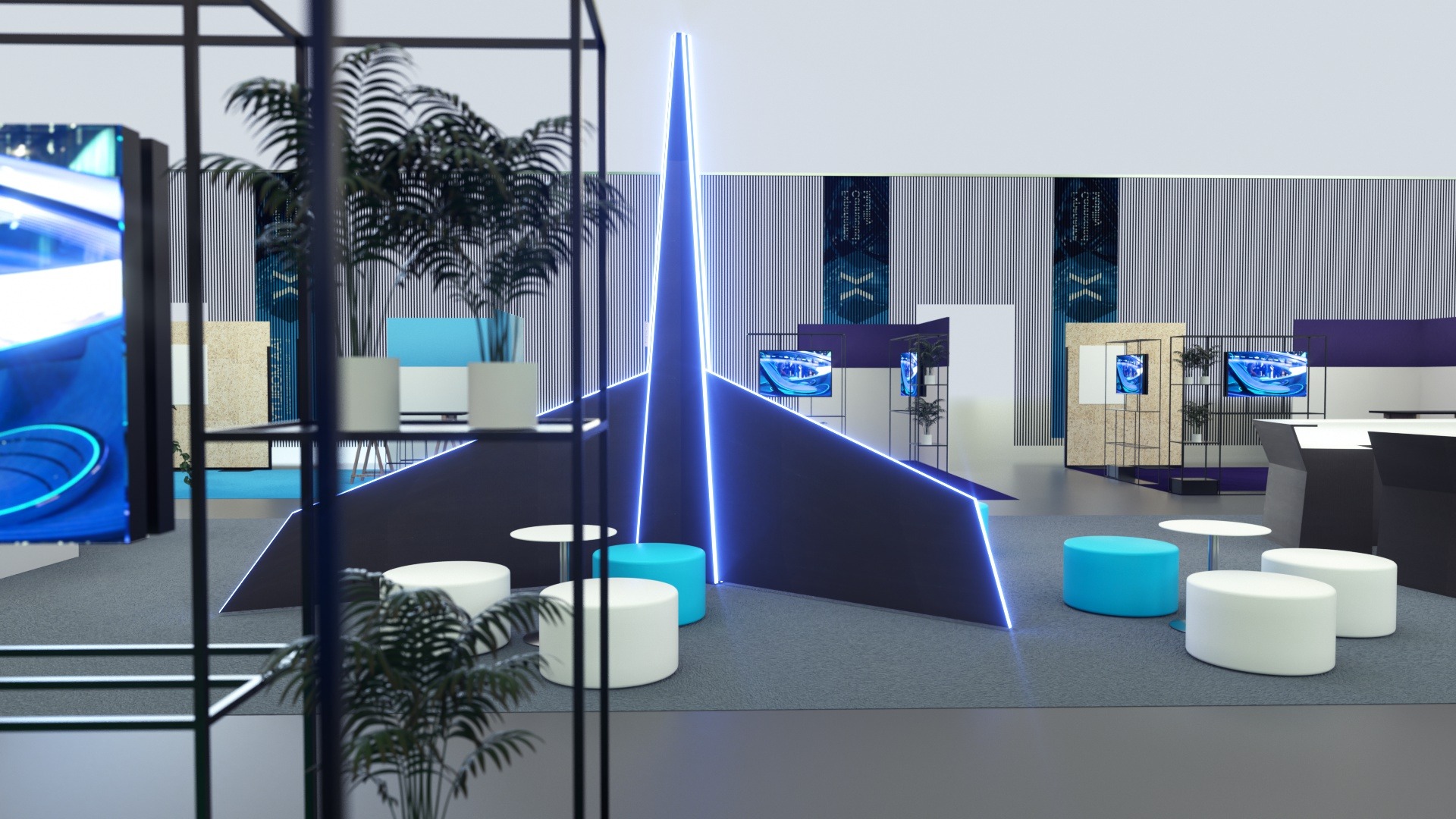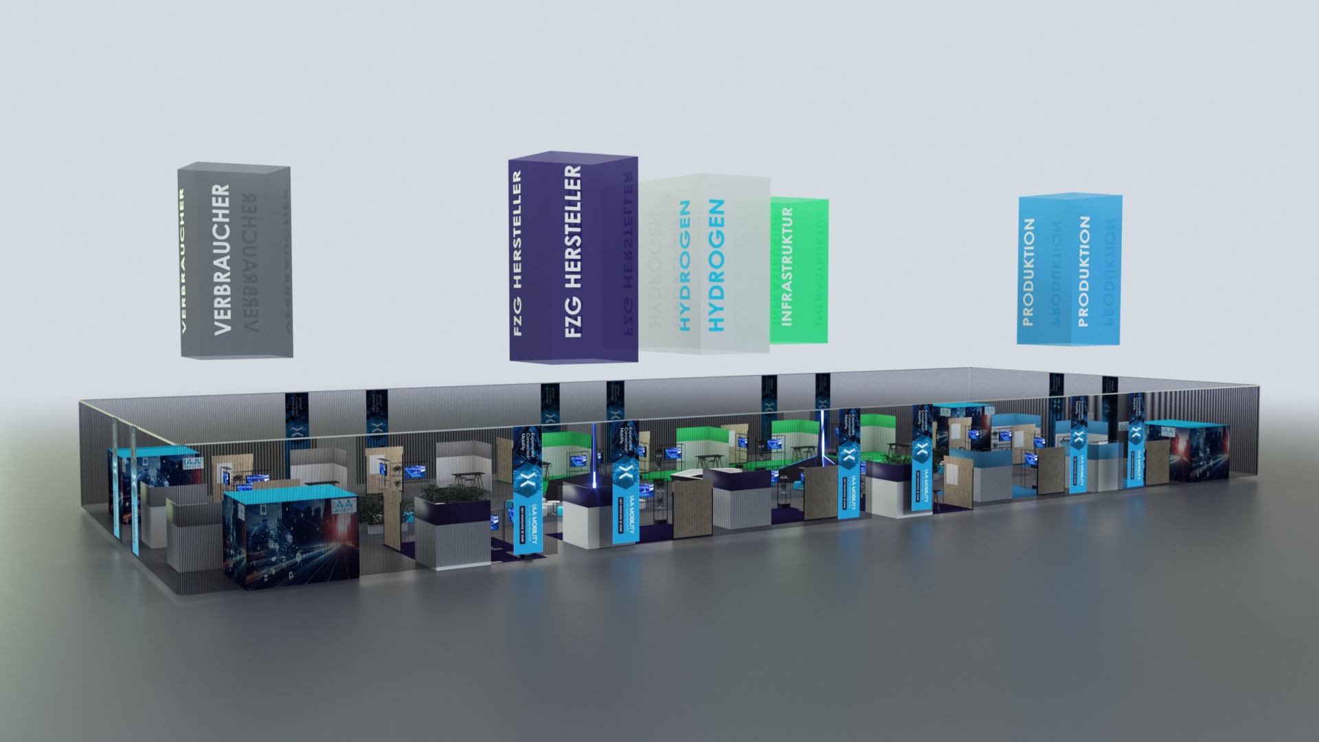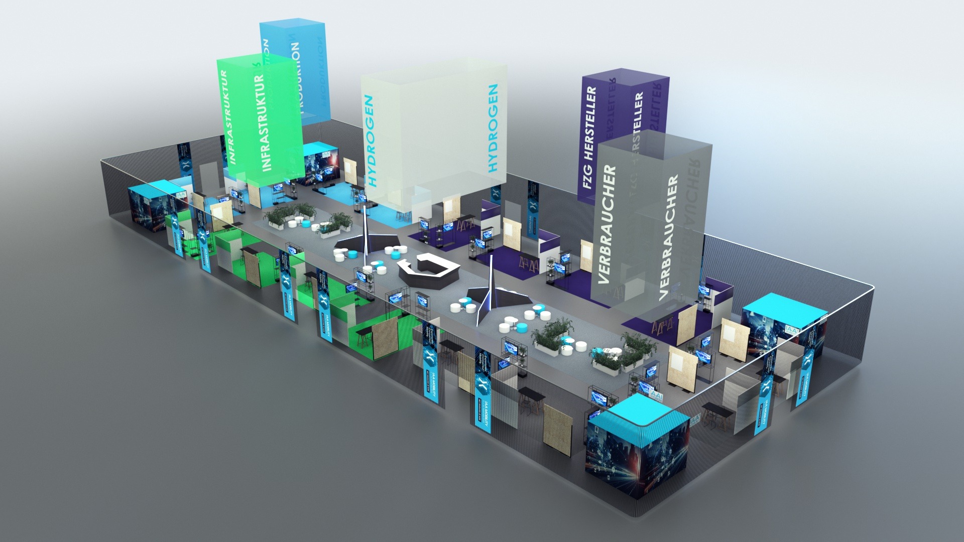 Ein Beispiel für die Wandelbarkeit und Modularität der Pre-built-Systeme von ARNO Design. Zum Thema Wasserstofftechnologie wurde ein Präsentations- und Dialograum konzipiert, der durch seine Gestaltung Umweltverträglichkeit und Fortschrittsbegeisterung gleichermaßen demonstriert. Die Kombination aus unterschiedlichen ARNO Präsentationselementen, Bars und Lounges mit leichten aber markanten Stoffkuben und kraftvollen Farbakzenten transportiert das Thema architektonisch überzeugend und plakativ nach innen und außen.