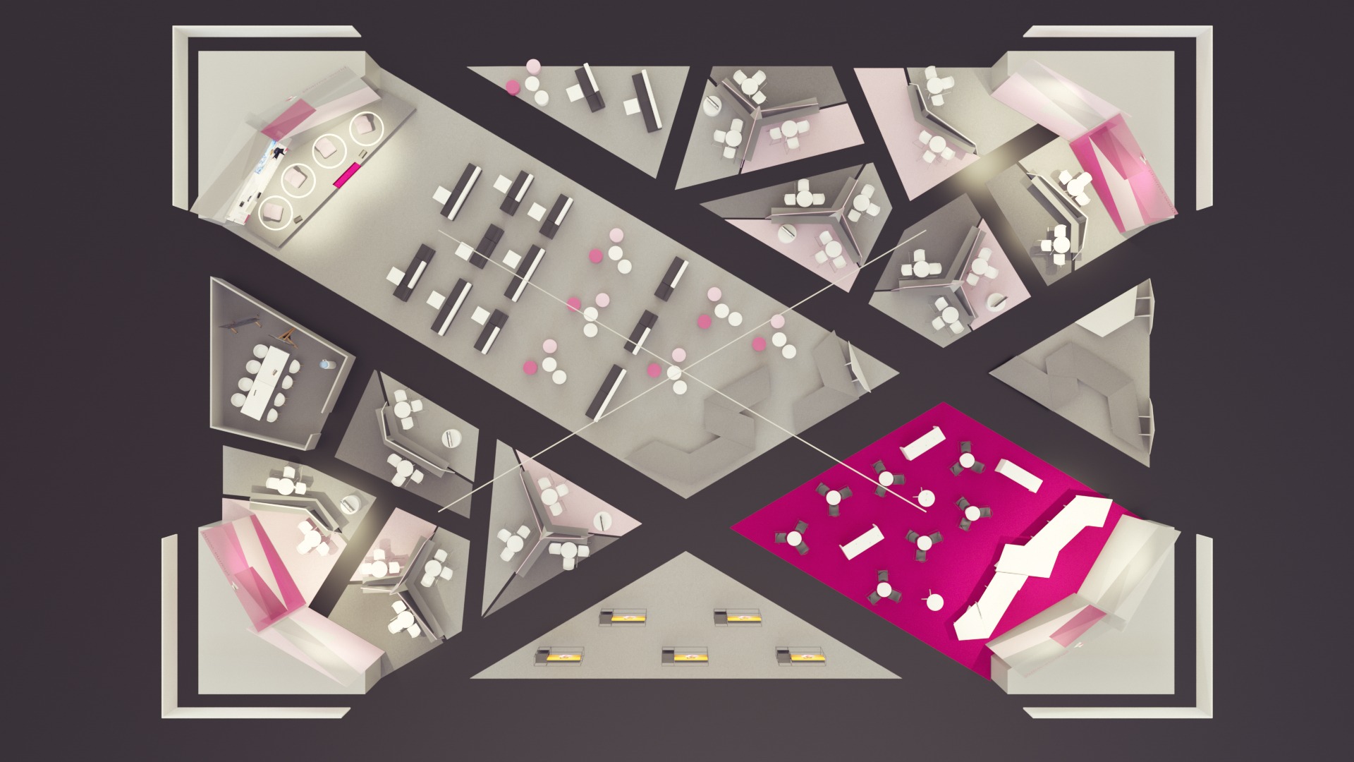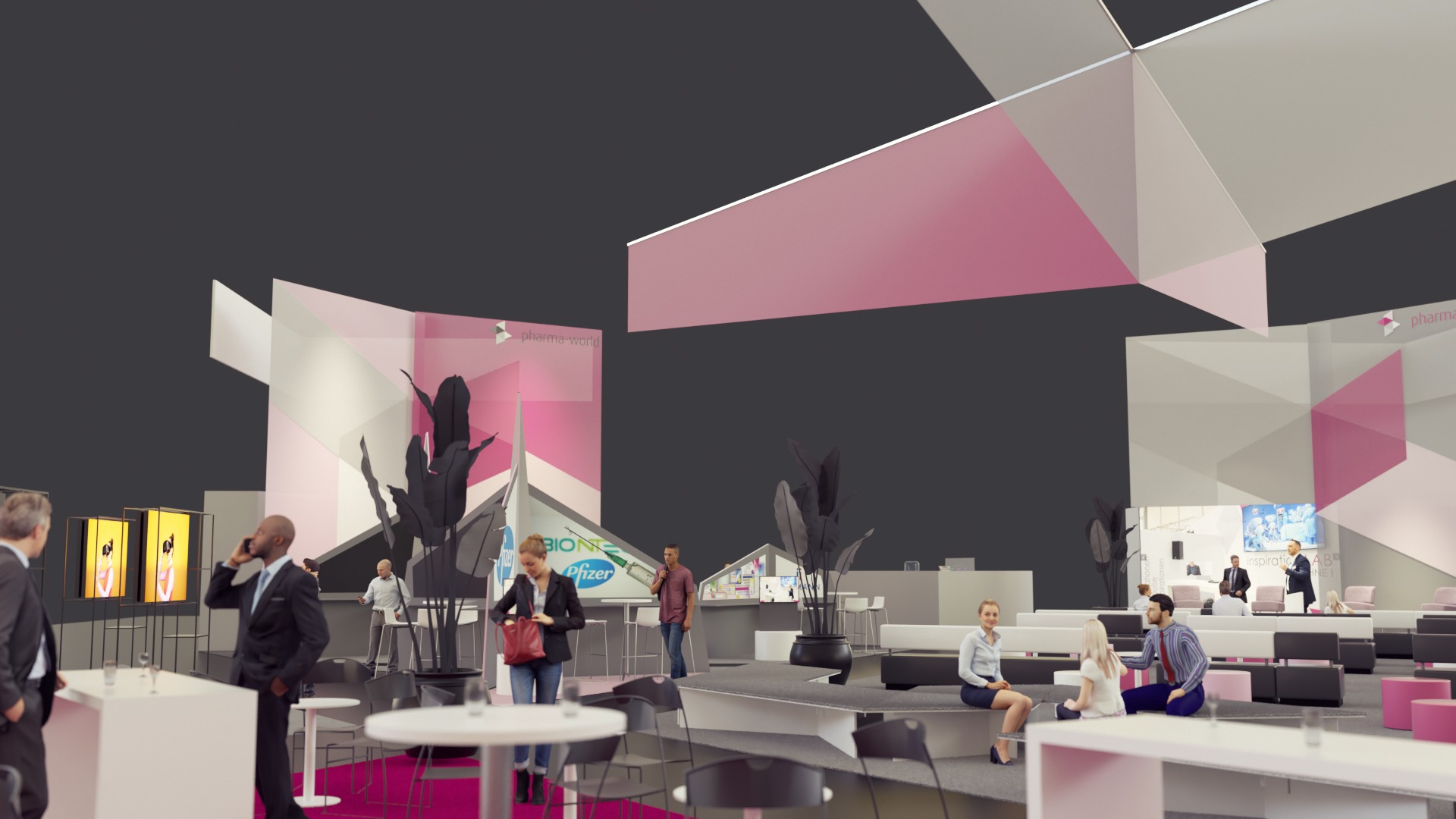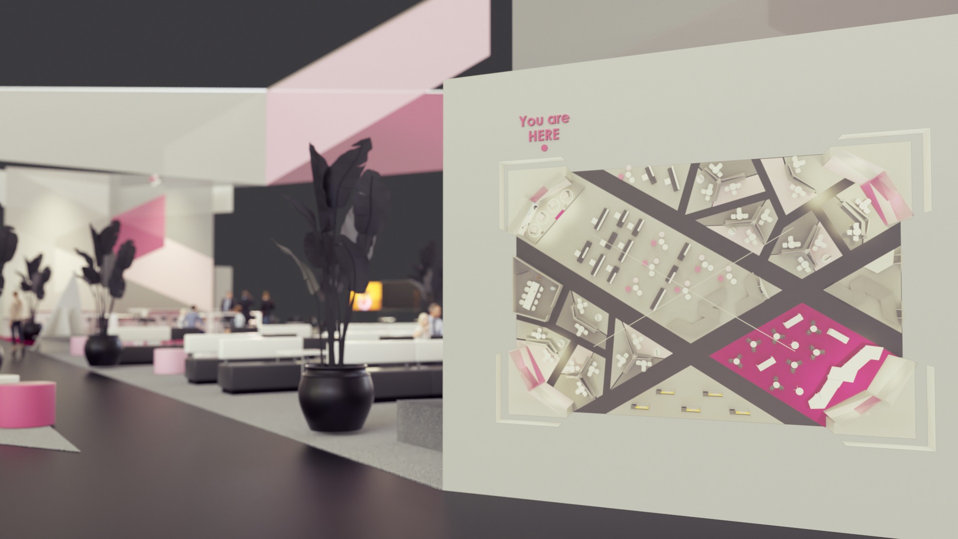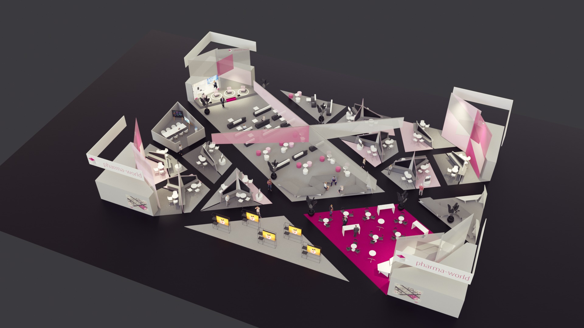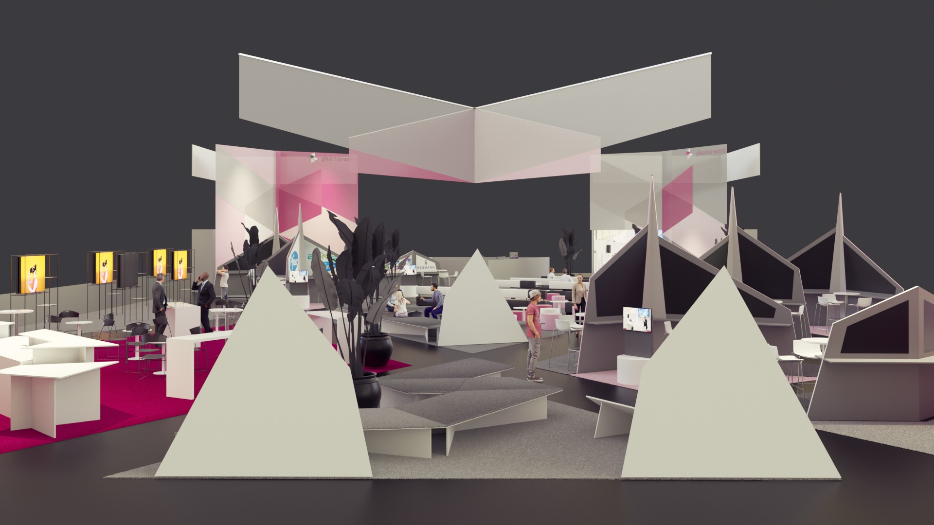 Die 3D animierten sternförmigen Module können im virtuellen Raum beliebig gruppiert und erweitert werden. Jede Fläche kann durch individuelle Grafik, Verlinkung, Filme und die Farbgestaltung sehr einfach an den jeweiligen Aussteller angepasst werden.